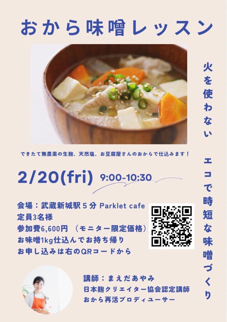 【2/20】時短で簡単!こだわりのおから味噌作り教室開催(講師:まえだあやみ)