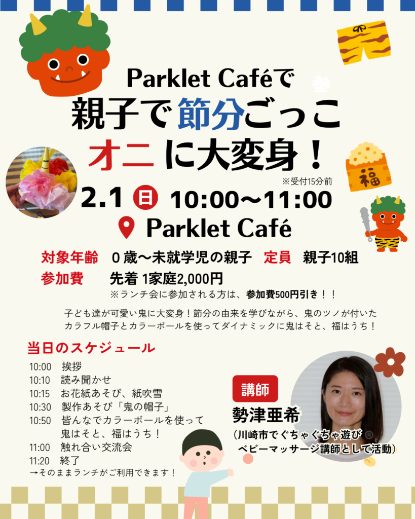 【2/1】ParkletCafeで親子で節分ごっこ★鬼に大変身(講師:勢津亜希)